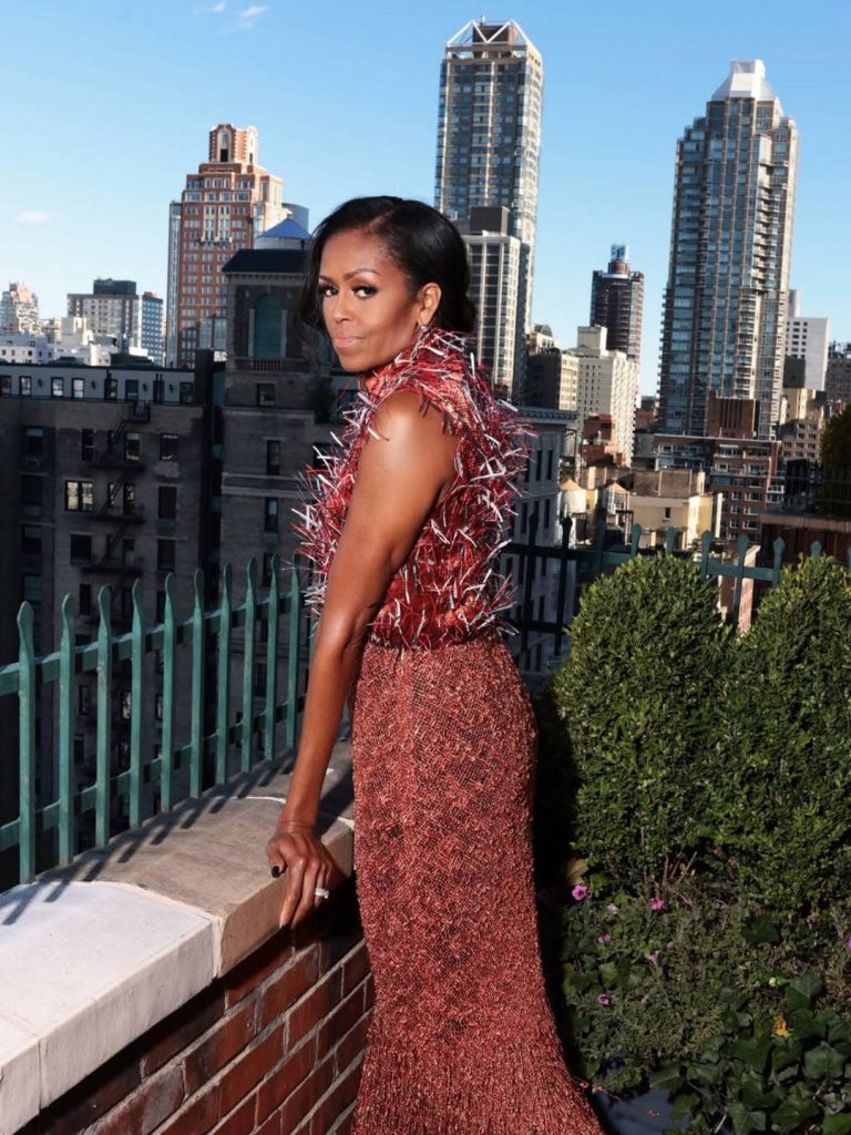 Michelle mengenakan busana bernuansa burgundy yang menonjolkan permainan tekstur dan warna. Atasan tanpa lengan yang dikenakannya dihiasi detail bulu dalam gradasi merah dan putih, menciptakan tampilan dramatis sekaligus elegan. Penampilan ini dipilih dan ditata oleh kolaborator lamanya sekaligus rekan penulis buku, Meredith Koop.